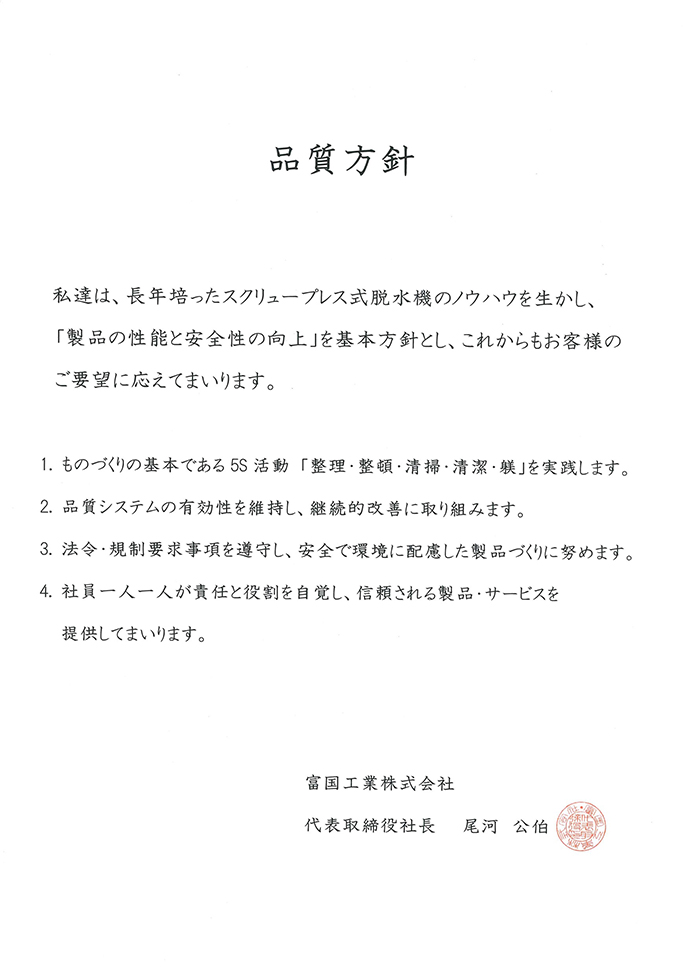 品質方針|スクリュープレス脱水機なら完全受注生産の富国工業株式会社
